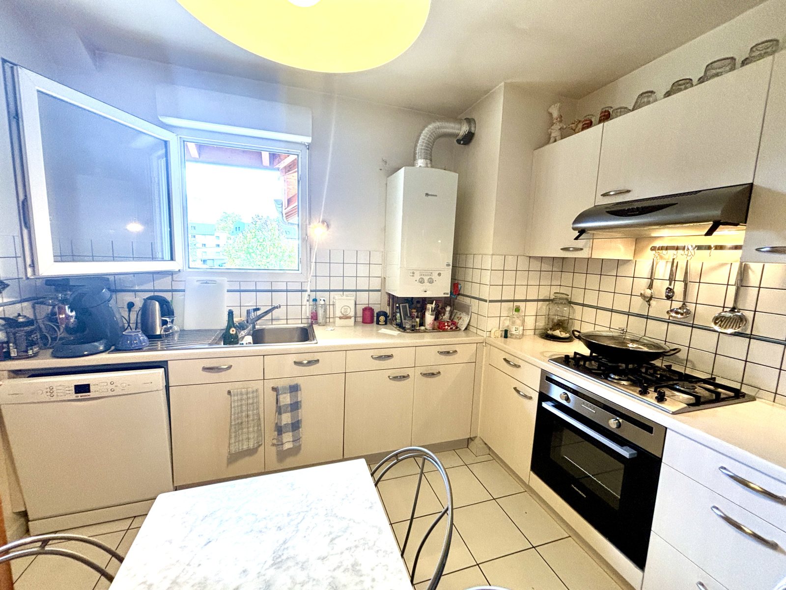 La cuisine est une pièce repas. Le séjour s'ouvre sur la terrasse.
