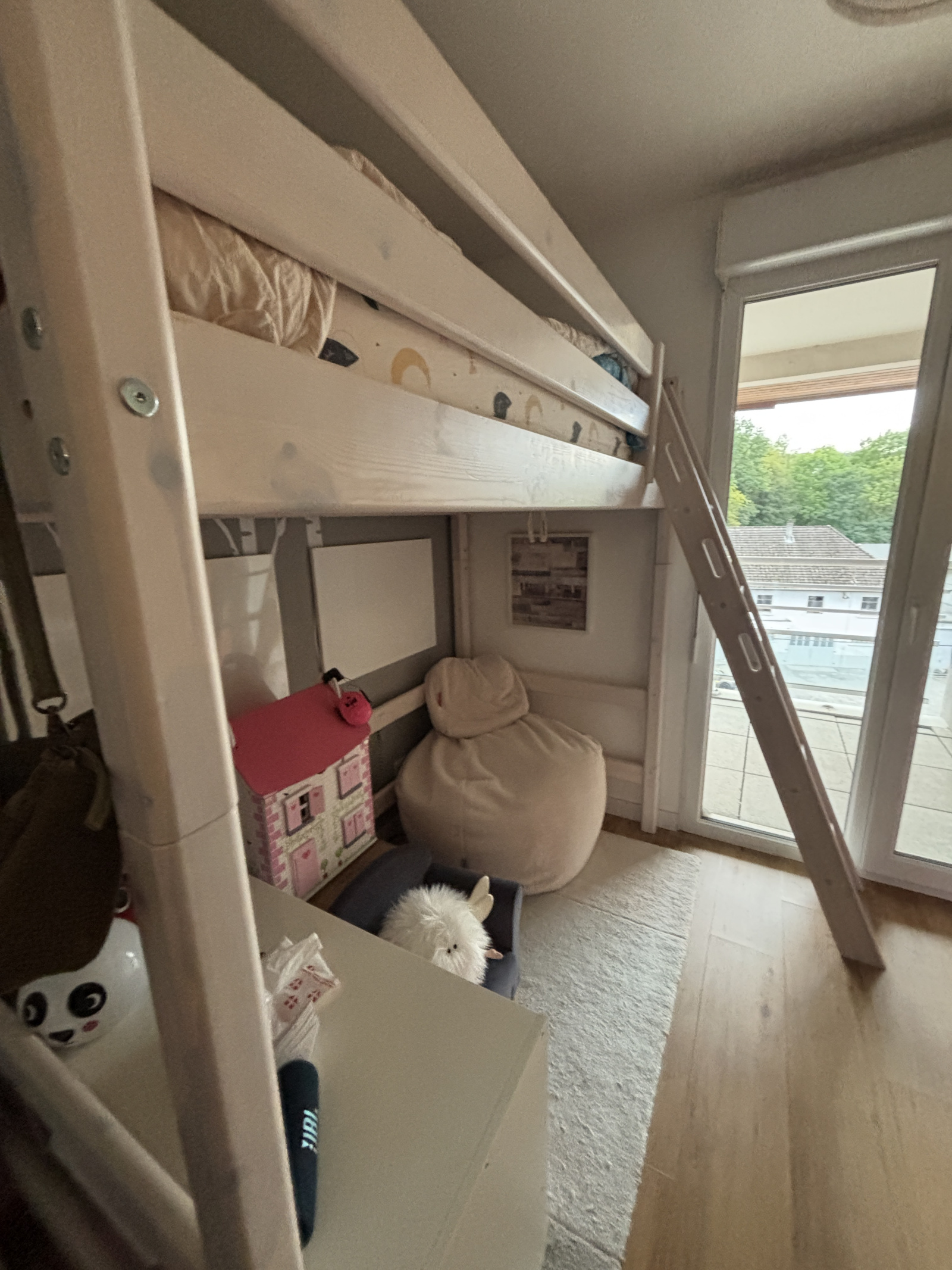 La partie nuit se compose de trois chambres, toutes équipées de rangements et communiquant avec un balcon abrité et les terrasses. La salle de bains dispose d’une baignoire, d’une douche et d’un espace buanderie pratique. Un WC séparé complète cet agencement fonctionnel.