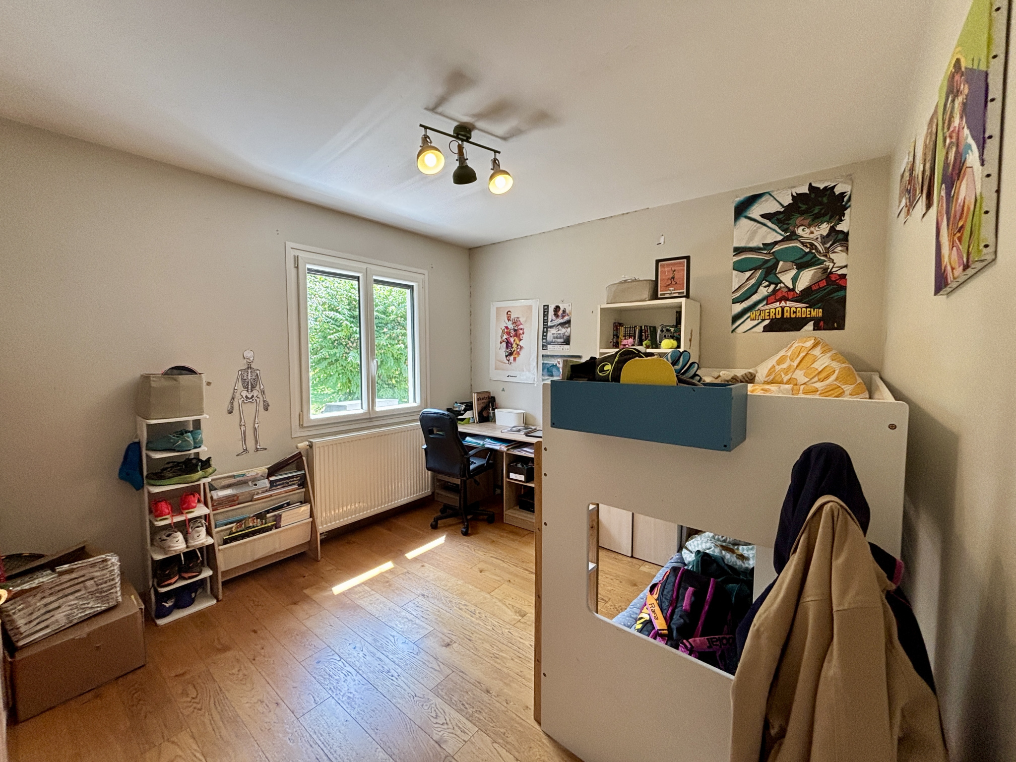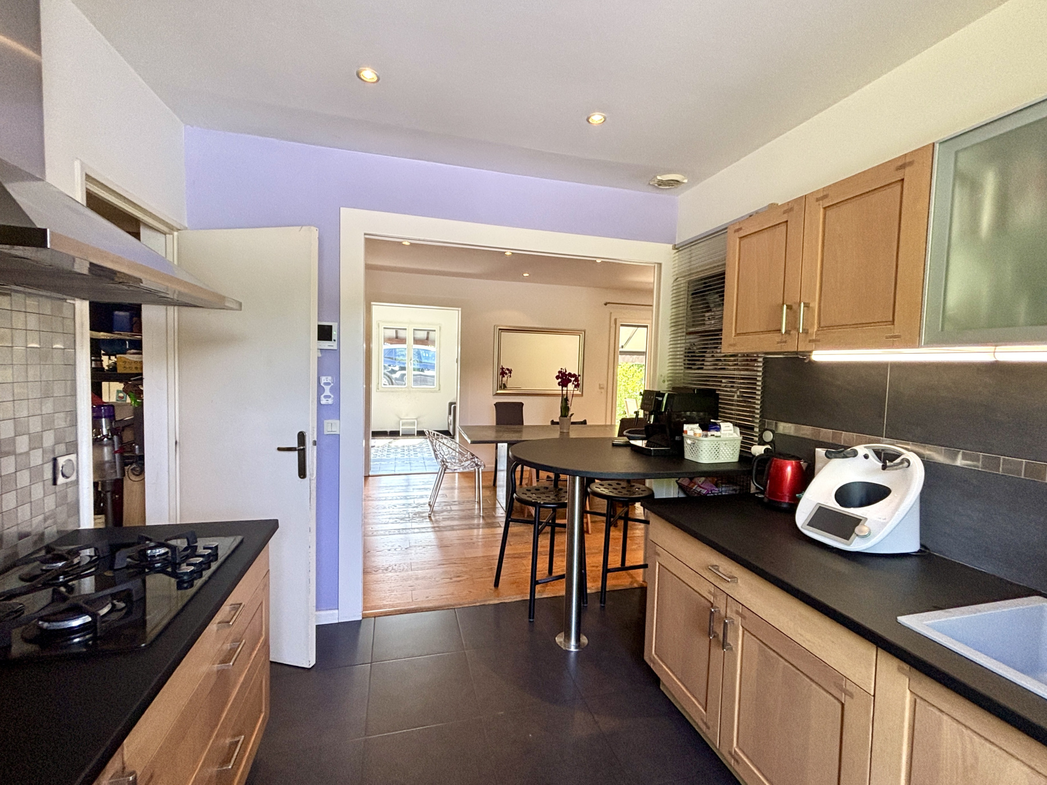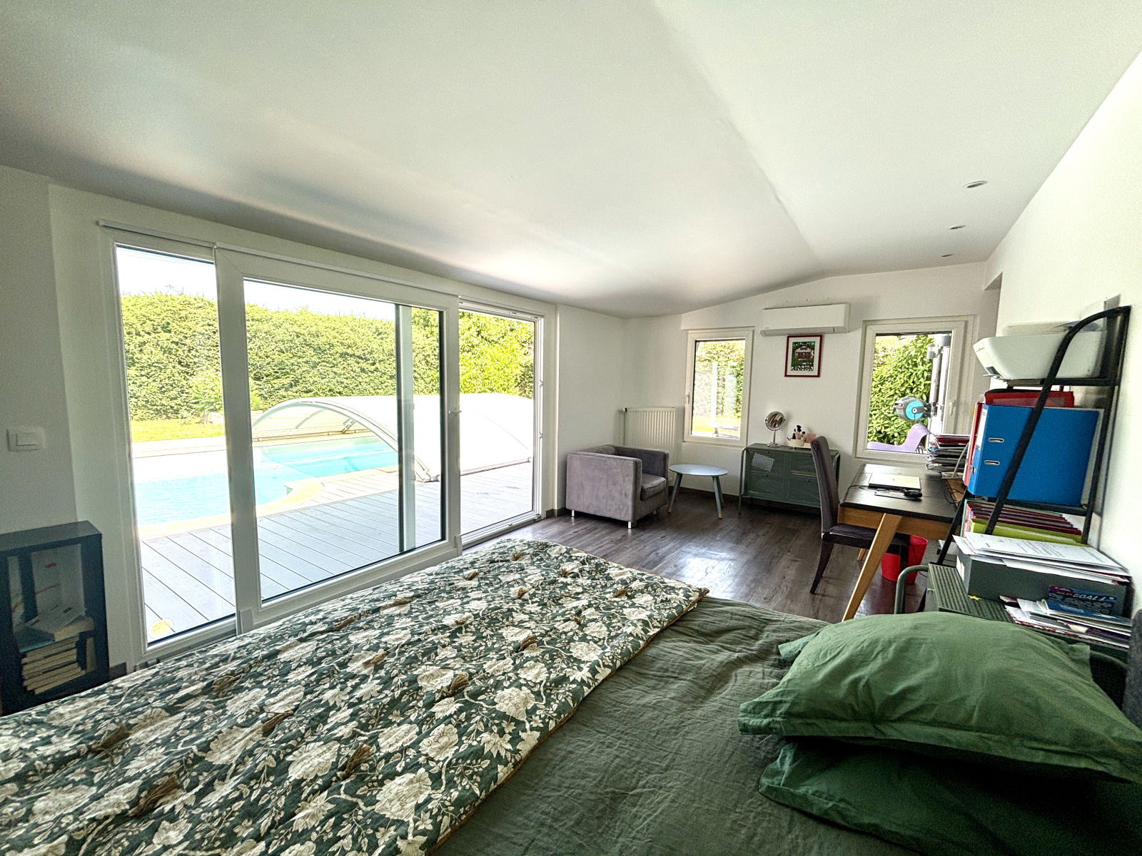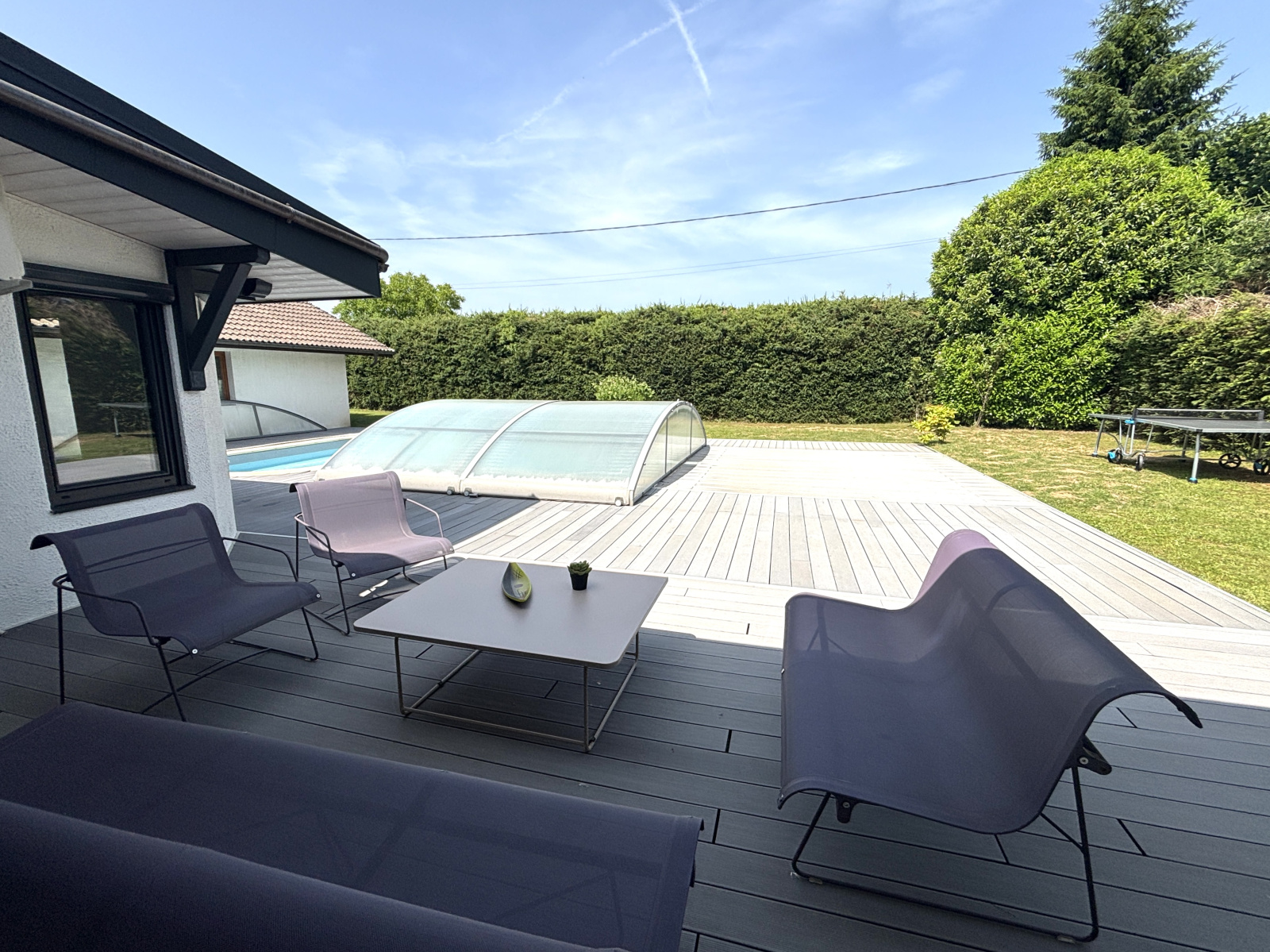 À l’extérieur, le terrain clos et arboré de 1 305 m² accueille une piscine de 4x8 m équipée d’un dôme coulissant, permettant une utilisation prolongée sur l’année. Plusieurs coins ombragés invitent à la détente.