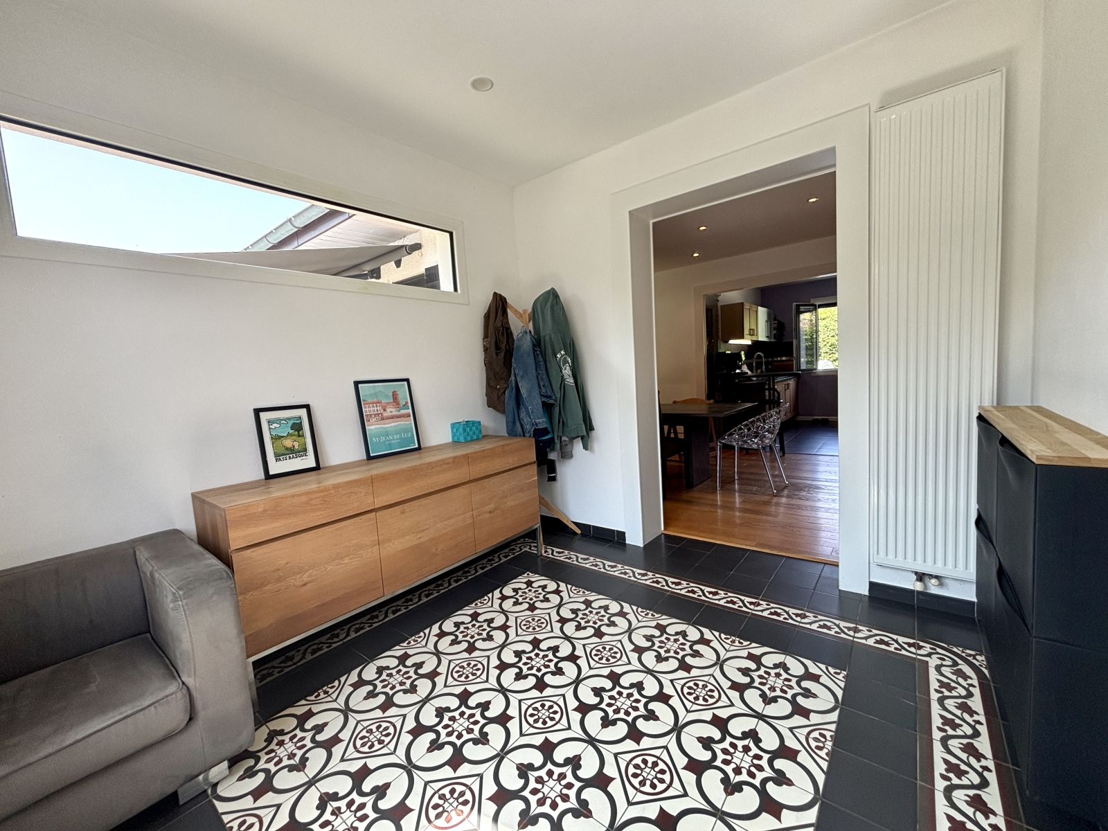 Avec une surface habitable de 110 m², la maison se compose d’un séjour lumineux de 29 m² avec accès direct à la terrasse couverte, idéal pour les repas en extérieur. La cuisine américaine, entièrement équipée, s’ouvre sur l’espace de vie pour plus de convivialité. Un cellier/buanderie complète cet espace jour.