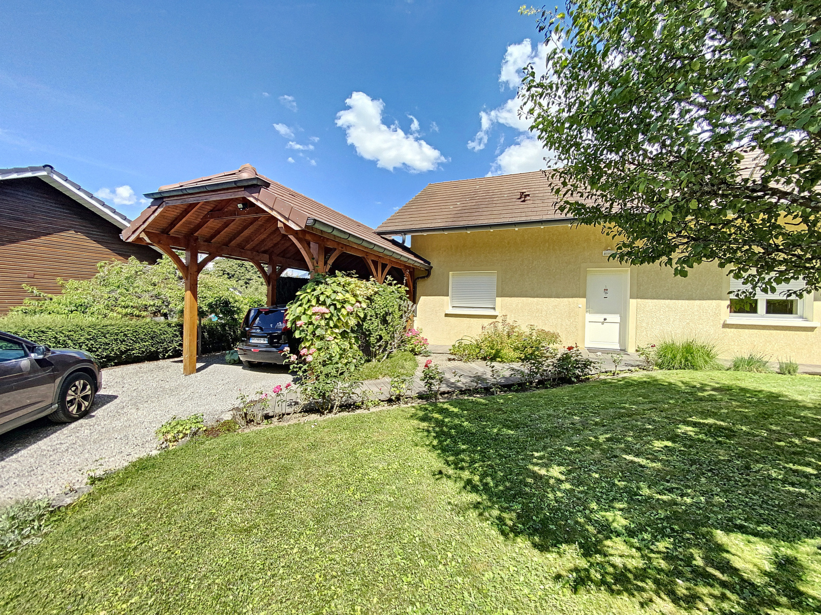 Profitez d'un garage, directement accessible depuis l'intérieur de la maison ainsi qu'un carport pour deux voitures. Plus besoin de vous soucier des intempéries ou de transporter vos courses sur de longues distances.